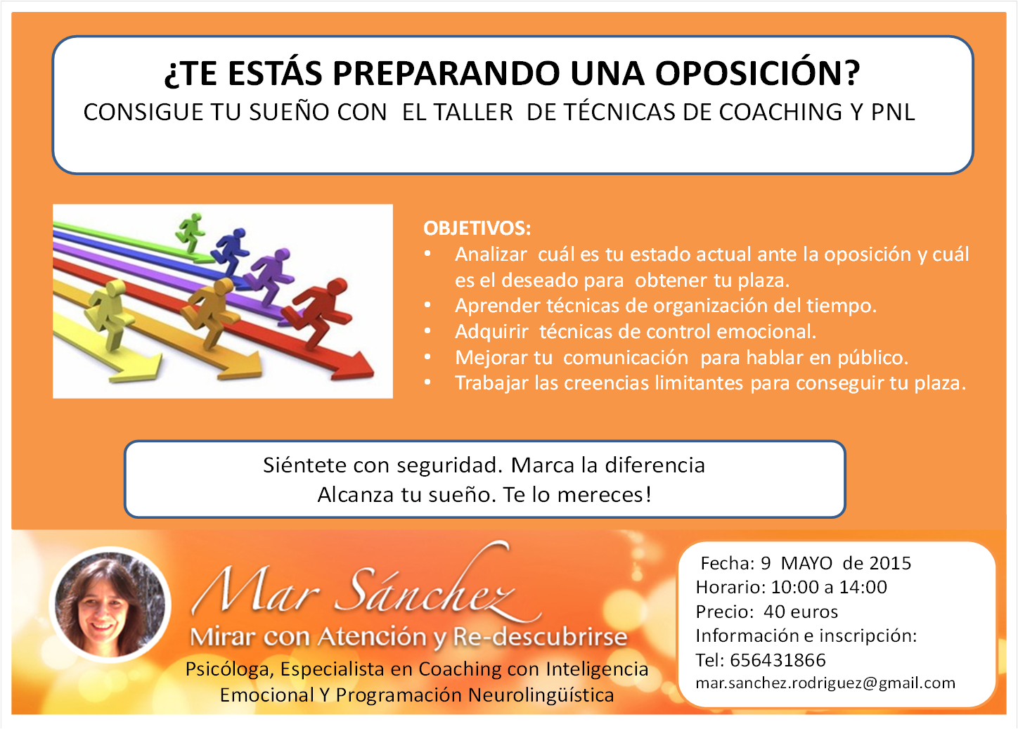 Si deseas sentirte feliz con tu esfuerzo, con todo tu saber, este taller te posibilita trabajar para el desapego al resultado, para conseguir una satisfacción personal en todo tu trabajo personal. El prepararse una oposición supone un gran sacrificio, en tiempo, renuncia a cosas apetecibles y sobre todo un momento de concentración para estar centrada en la tarea a desarrollar. Con el taller, te proporciono la motivación necesaria para garantizar la preparación personal que te ayude a estar centrado en tu objetivo, para trabajar las posibles distracciones que pudieran surgir y sobre todo, para estar feliz, día a día contigo mismo/a.